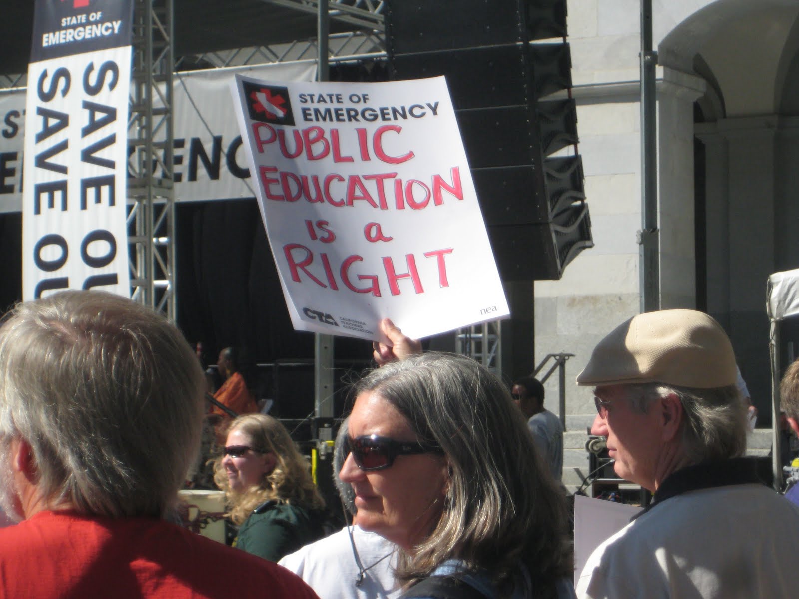 The amusing part is that the whole reason for this event had already been solved by the time it happened. An unexpected $2.5 billion dollar rise in incoming tax revenues enabled the Republican minority in the state legislature to offer a budget that fully funded Prop 98, which mandates a certain percentage of the state budget go toward education. Of course, the Republican-hating attendees of this rally didn't want to hear that. I'm sure the thought of the Republican Party saving their bacon is a horror they wish not to contemplate. But then, that wasn't the main motivation for this whole affair in the first place. This sign gives a better summation: